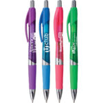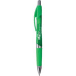 Eye-catching promotional pen with unique details and a budget price. Features jumbo barrels in translucent brights with chrome trim. Shapely and colorful comfort grip for writing ease. Includes a Hub branded silver band. High value at budget price.